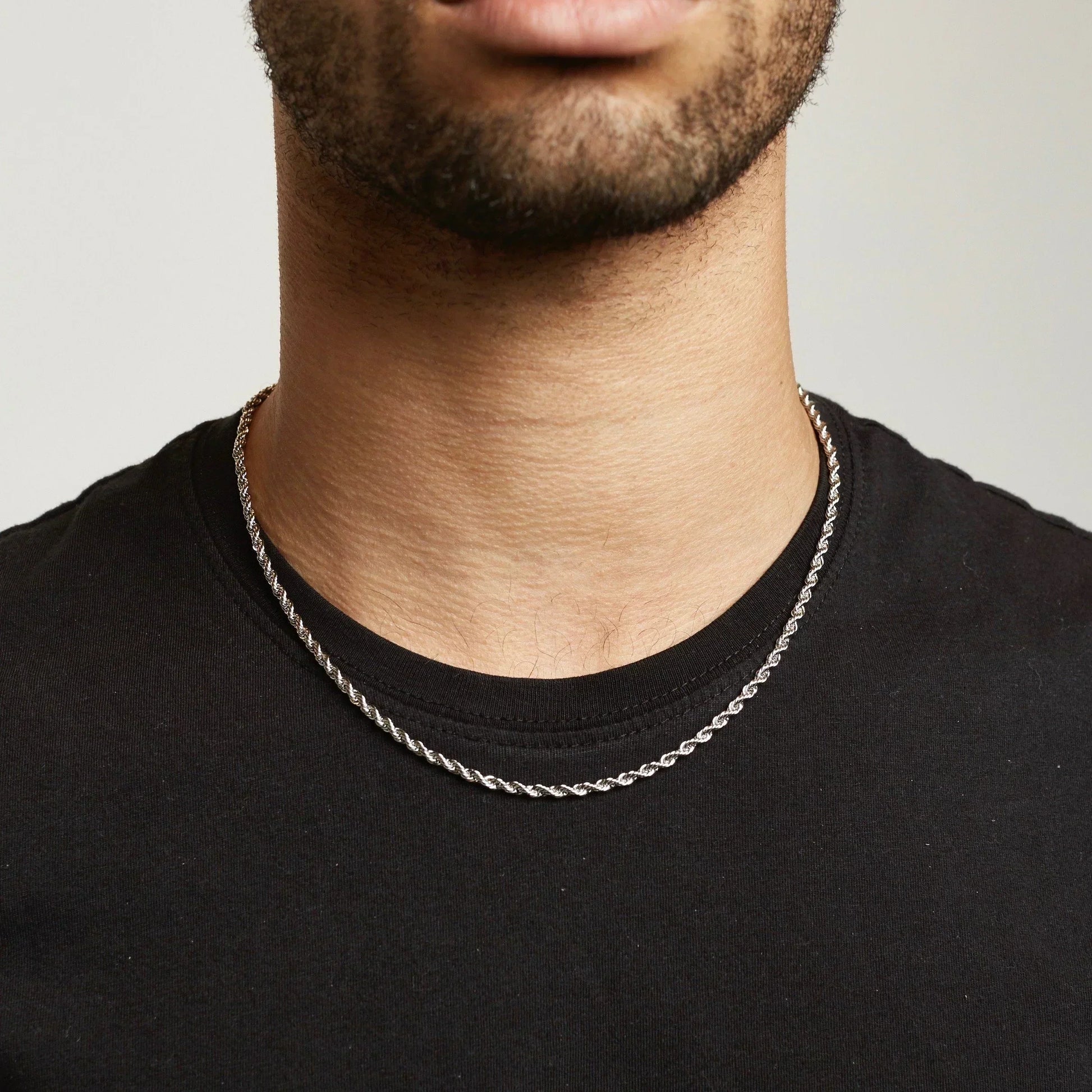This chain adds a touch of luxury to your everyday wardrobe. The silver plating not only makes it look great but also ensures it will last. Whether youre accessoring a chill, everyday style or looking to stand out on special occasions, the 3mm Silver Rope Chain gives you the perfect balance of chic, bold confidence.